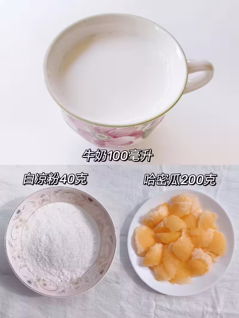 ❤️食材:哈密瓜200克+白涼粉40克+牛奶100毫升