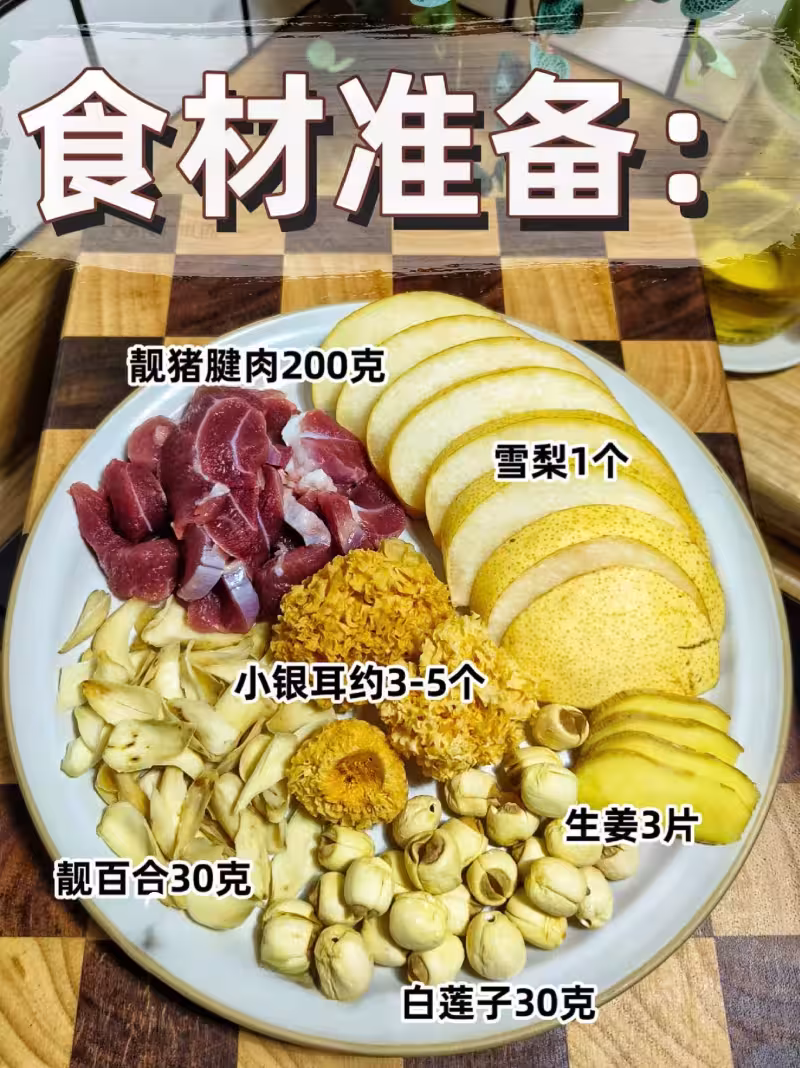 食材:豬腱肉,雪梨,小銀耳,生薑,白蓮子,百合