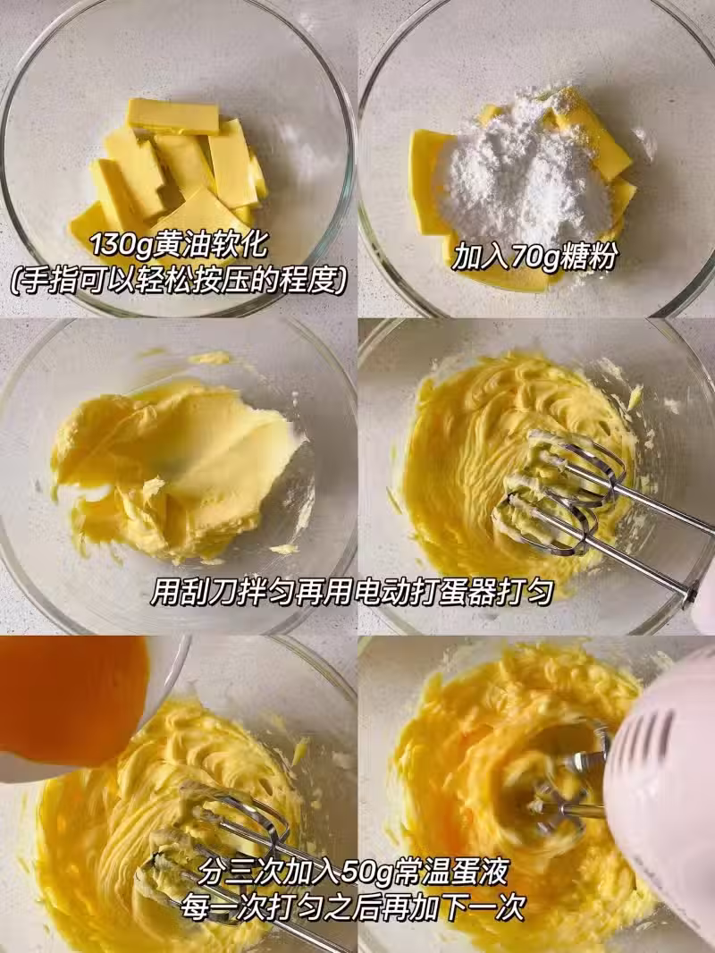 1️⃣黃油軟化(手指可以輕鬆按壓的程度),加入糖粉用刮刀拌勻再用電動打蛋器打勻