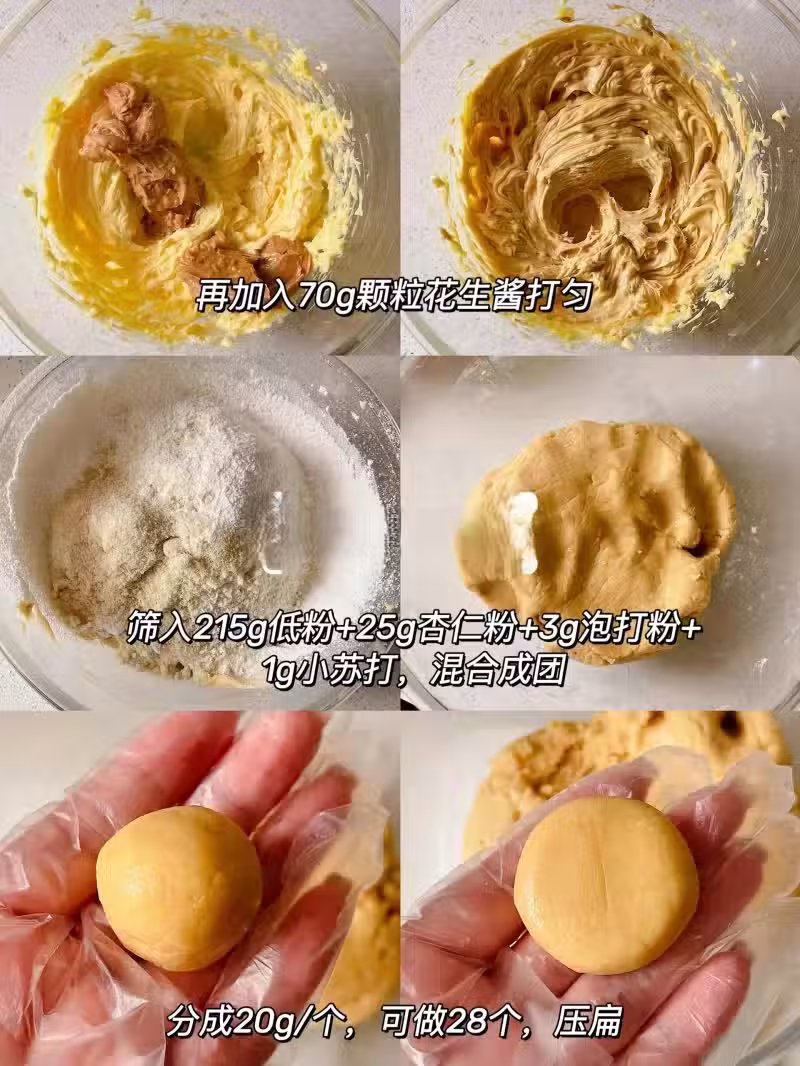 4️⃣分成20g/個,可做28個,壓扁,表面刷一層蛋黃液,沾滿花生碎