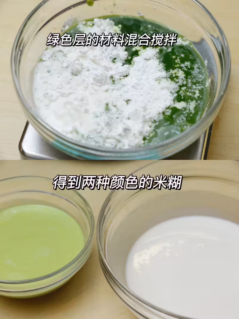 4.蒸製:取適量米糊,倒在平盤上,大火蒸1分鐘左右,直到米糊凝固即可。倒入等量的另外一種顏色的米糊,蒸熟後重複以上步驟,以此類推將兩種顏色的層次交替疊加。