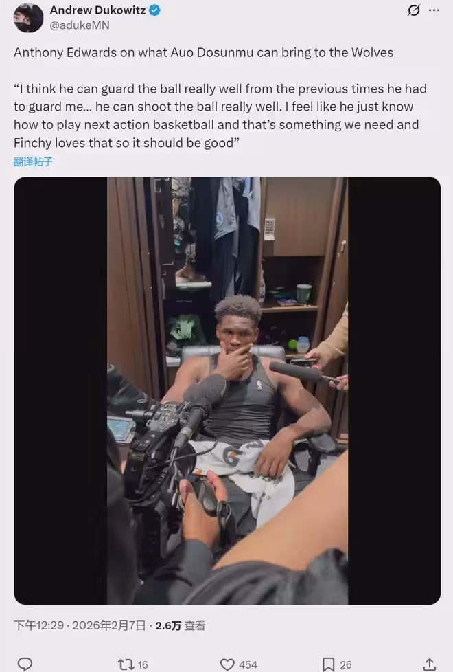 2月7日,NBA常規賽,森林狼115-119不敵鵜鶘。愛德華茲賽後接受採訪談到新援阿約-多森姆:「他防守能力很強,投籃也很準,這對我們來說是很棒的補充。」主帥芬奇說:「如果我不把多森姆排進輪換前8,我可能會被解僱。」