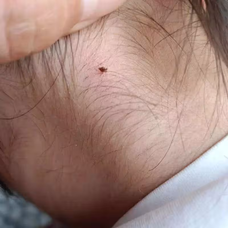 媽媽趕緊拿手機的手電筒來一照,發現好像不像是痣,用手去摸,感覺還凸起來的,陳媚就想起來這應該是蜱蟲,她就跟老公說這應該是蜱蟲