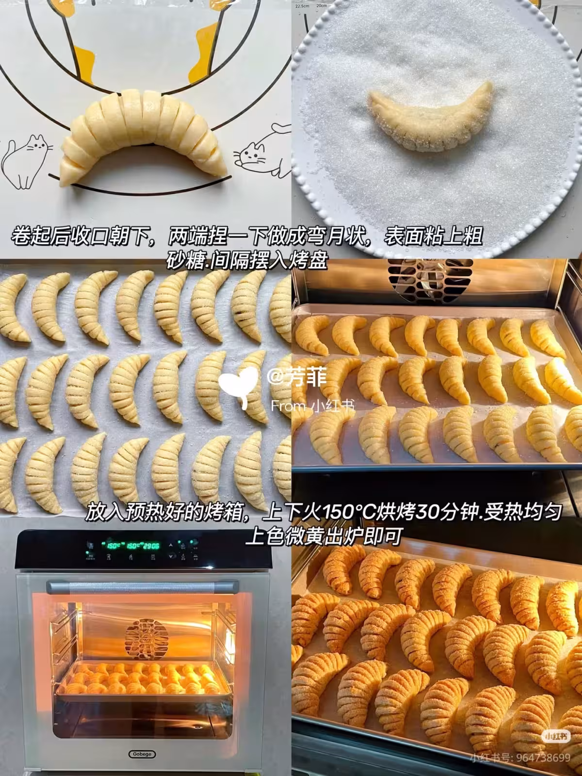 4️⃣表面粘上粗砂糖.間隔擺入烤盤,放入預熱好的烤箱,上下火150℃烘烤30分鐘.烤箱受熱均勻上色微黃出爐即可⚠️具體烘烤溫度和時間需按自家烤箱溫差靈活調節