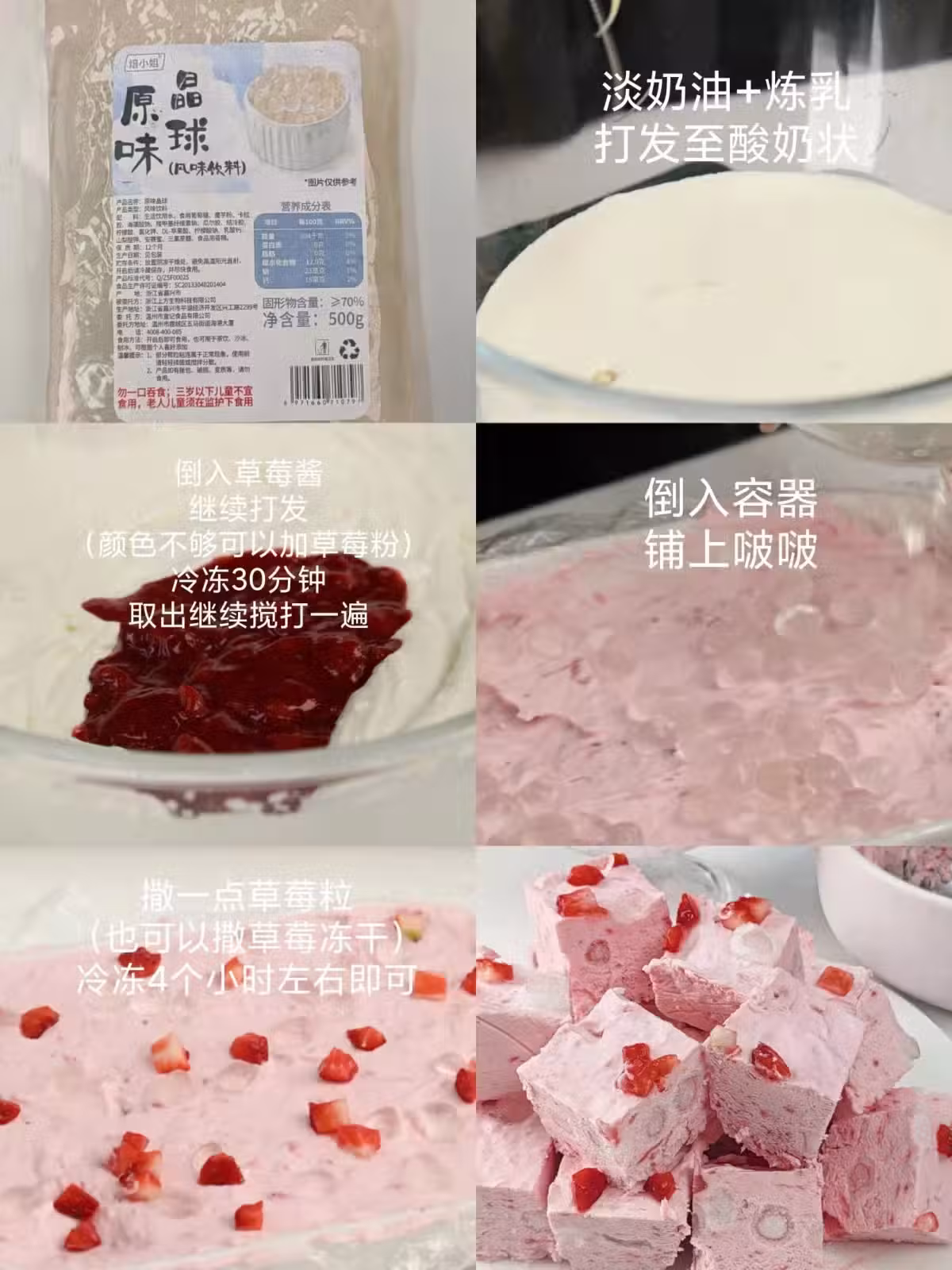 1。 淡奶油+煉乳,打發至酸奶狀,倒入草莓醬,繼續打發(顏色不夠可以加點草莓粉)