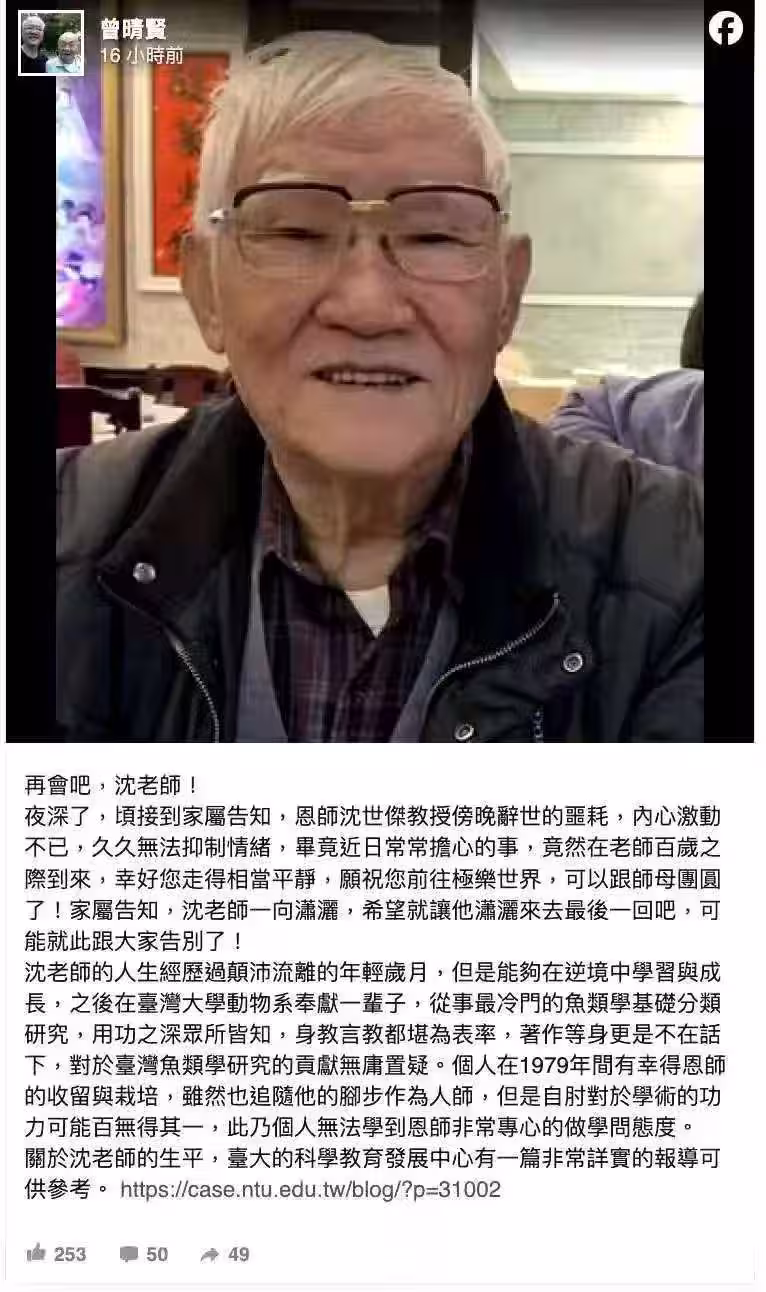 沈世傑教授1926年出生於山東,被視為繼陳兼善之後,台灣魚類研究的集大成者。