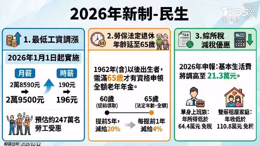 2026年將有試辦新制上路,包括工廠月最低工資調漲至2萬9,500元、時薪196元;鋼筋加強頂樓加蓋、違建等非法建築;育嬰開放以「日」為單位申請申請;廣播機構擬推出5月大平日國旅補助方案、衛福部推出「健康幣期」為「健康幣訓」;「TVBS新聞網」整理2026各項新制,帶您一次了解。