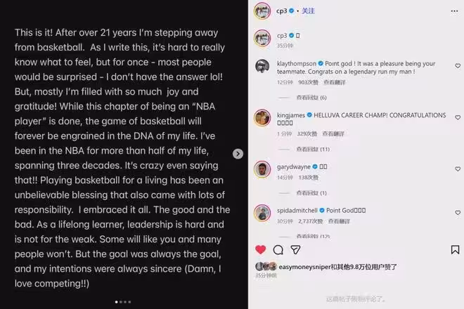 2月14日凌晨,克里斯-保羅更新個人社交媒體,宣布正式從NBA退役,結束21年的職業生涯。本賽季交易截止日,保羅被快船交易到猛龍,今天凌晨被猛龍裁掉。他沒有繼續尋找下家,而是頭也不回地離開了這個聯盟。
