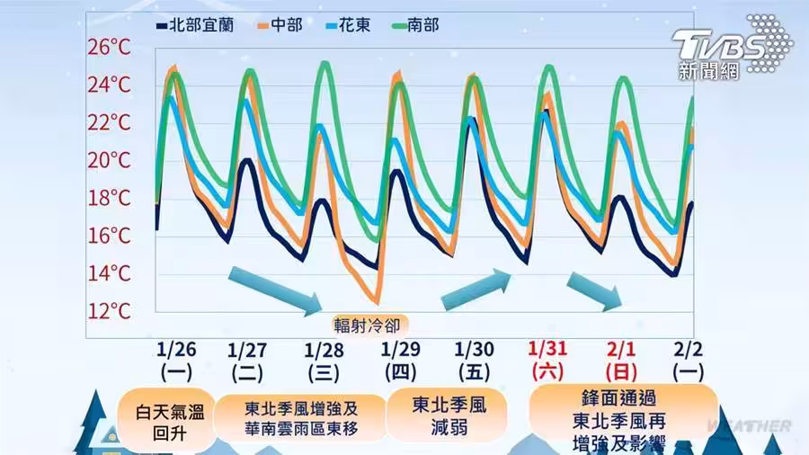 受大陸高壓、東北季風影響,周二起全台出現明顯降溫,並伴隨降雨。氣象粉專「天氣風險 WeatherRisk」主播忠瑋指出,本周二(27日)至下周二(2/3)將有2波冷空氣南下,有機會達到大陸冷氣團等級,氣溫起伏大。