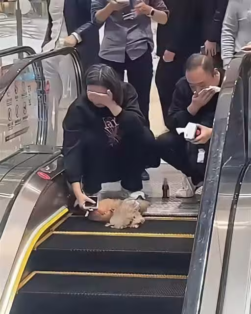 蹲在梯旁的兩位民眾,一位是趕來的寵物主人,另一位是熱心路人,他們顧不得電梯仍在緩緩運轉的危險,半蹲在梯級邊緣試圖救援。主人的情緒幾近崩潰,雙手緊握又鬆開,既怕觸碰會加重愛犬的傷勢,又捨不得離開半步;旁邊的路人則一邊安撫情緒,一邊翻找隨身物品,試圖找到能撐開縫隙的工具,臉上同樣布滿焦急與心疼。周圍的民眾也紛紛伸出援手,有人趕去通知商場工作人員緊急停梯,有人拿出手機撥打救援電話,還有人主動維持秩序,避免人群擁堵阻礙救援。