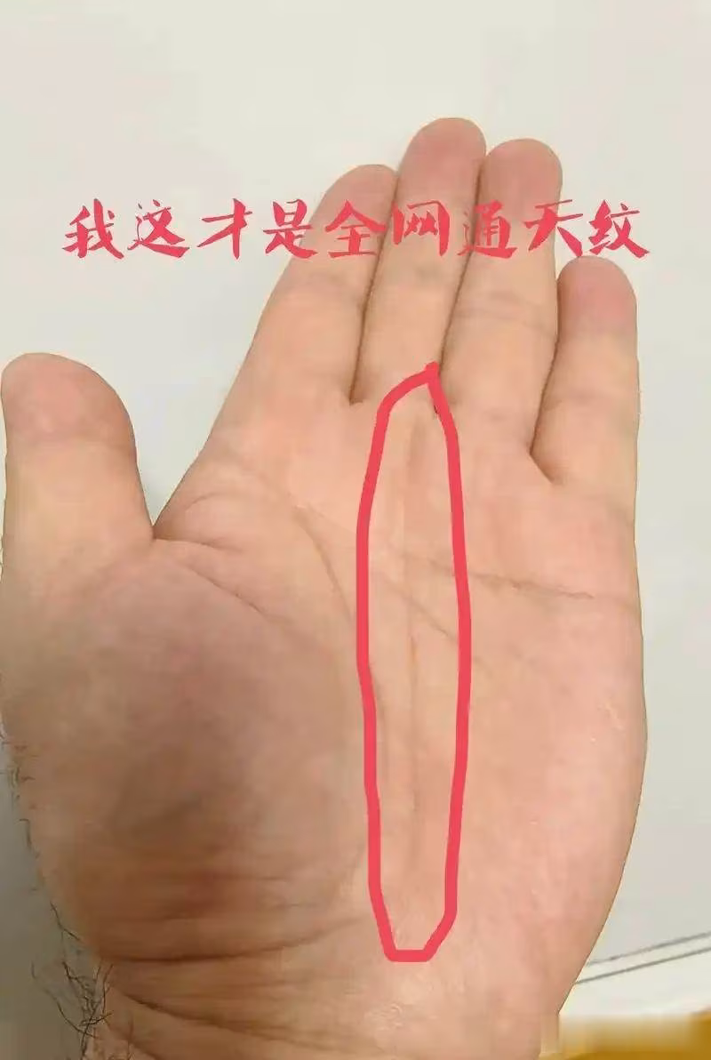 攤開手掌,如果在你的事業線(玉柱紋)底部開始,有一條清晰的豎紋,筆直向上穿過感情線、智慧線,直抵中指根部,這便是傳說中的 「通天紋」 ,也叫「穿錢紋」。