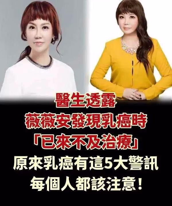 為了不讓爸媽或長輩嘗到「白髮人送黑髮人」的悲傷,大家要注意身體健康啊。2016年12月初薇薇安因為乳癌病逝,才43歲的生命,讓人感慨萬千!其實乳癌防治是可以從平時飲食做起,女性朋友除了「定期做自我檢查」外,以下提供乳癌5大警訊。43歲的薇薇安因為乳癌驟逝於關渡和信醫院,不只演藝圈朋友驚訝,也喚醒大家對乳癌防治的重視。