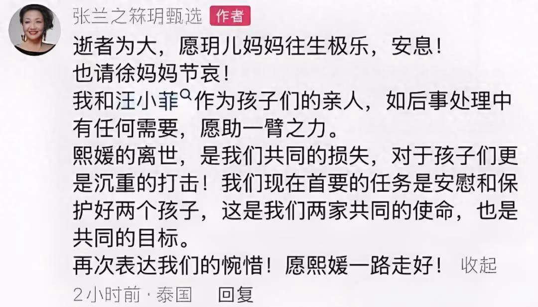 在她離世之後,其前夫汪小菲和前任婆婆均對公眾發聲,之後不久,其妹妹與母親也表達了各自的想法。