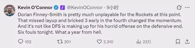 誰是火箭本賽季最失敗的引援?毫無疑問,芬尼-史密斯!NBA名記Kevin O'Connor寫道:「芬尼-史密斯在火箭的表現已經到了幾乎無法上場的地步。他在防守端的作用,也不能彌補他糟糕至極的進攻表現,真是噩夢一般的賽季!」