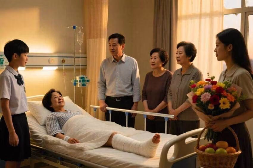 病房裡,王阿姨躺在病床上,右腿打著石膏吊著,臉色有些蒼白,但眼神依然銳利。