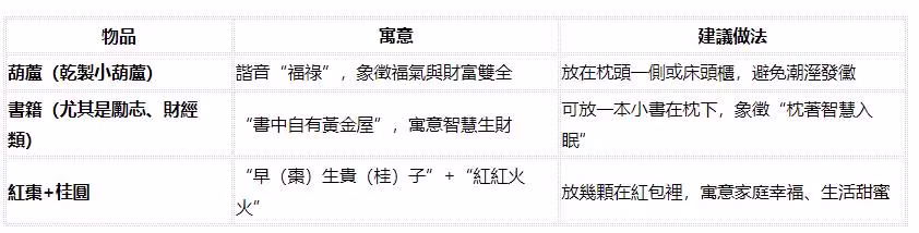 100元紙幣:諧音「百財」,寓意財源廣進「百」與「財」諧音,100元象徵「百財歸位」,放在枕頭下,寓意新的一年財源滾滾、富貴盈門。