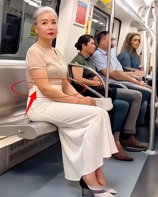 她身著透視短款上衣,搭配曳地闊腿褲,腳踩尖頭高跟鞋,端坐於捷運車廂中,身邊是身著普通通勤裝的乘客。