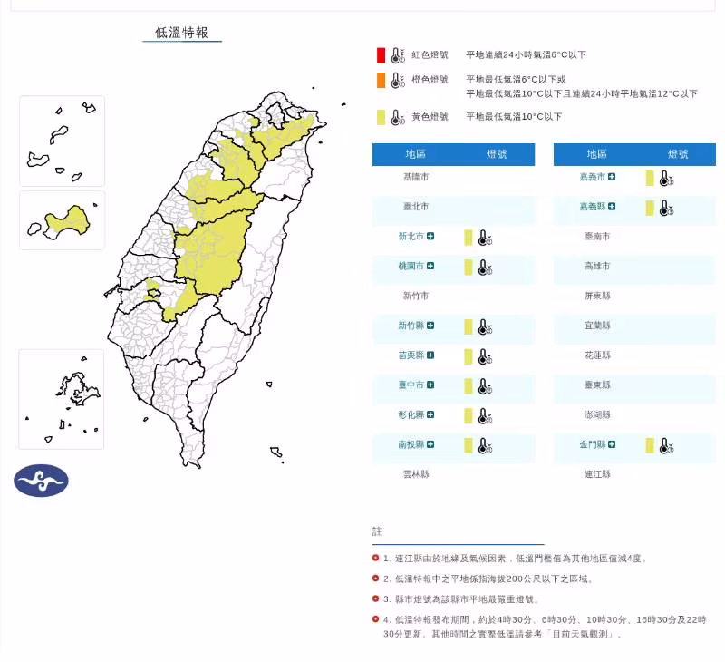 受輻射冷卻影響,中央氣象署發布10縣市低溫特報,12日清晨至上午,台中以北、彰化、南投、嘉義及金門區域性地區有10度左右氣溫發生的機率,且中南部日夜溫差大,提醒民眾提前做好禦寒措施。