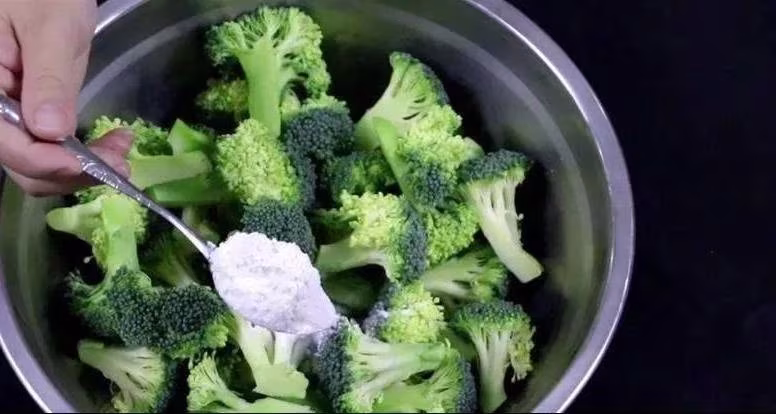 最後就是加水了,我們往盆里倒入沒過西蘭花的水,然後攪拌一下,使裡面的食鹽、小蘇打、麵粉都充分的溶解在水中。
