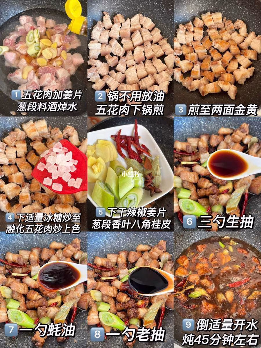 鍋中放油,油熱後下入五花肉煎至表面微焦,再加入蔥姜蒜爆香,倒入適量老抽、生抽、料酒、清水和冰糖調味,大火燒開轉小火燉煮40分鐘左右,直至五花肉酥爛入味,湯汁濃郁即可出鍋。