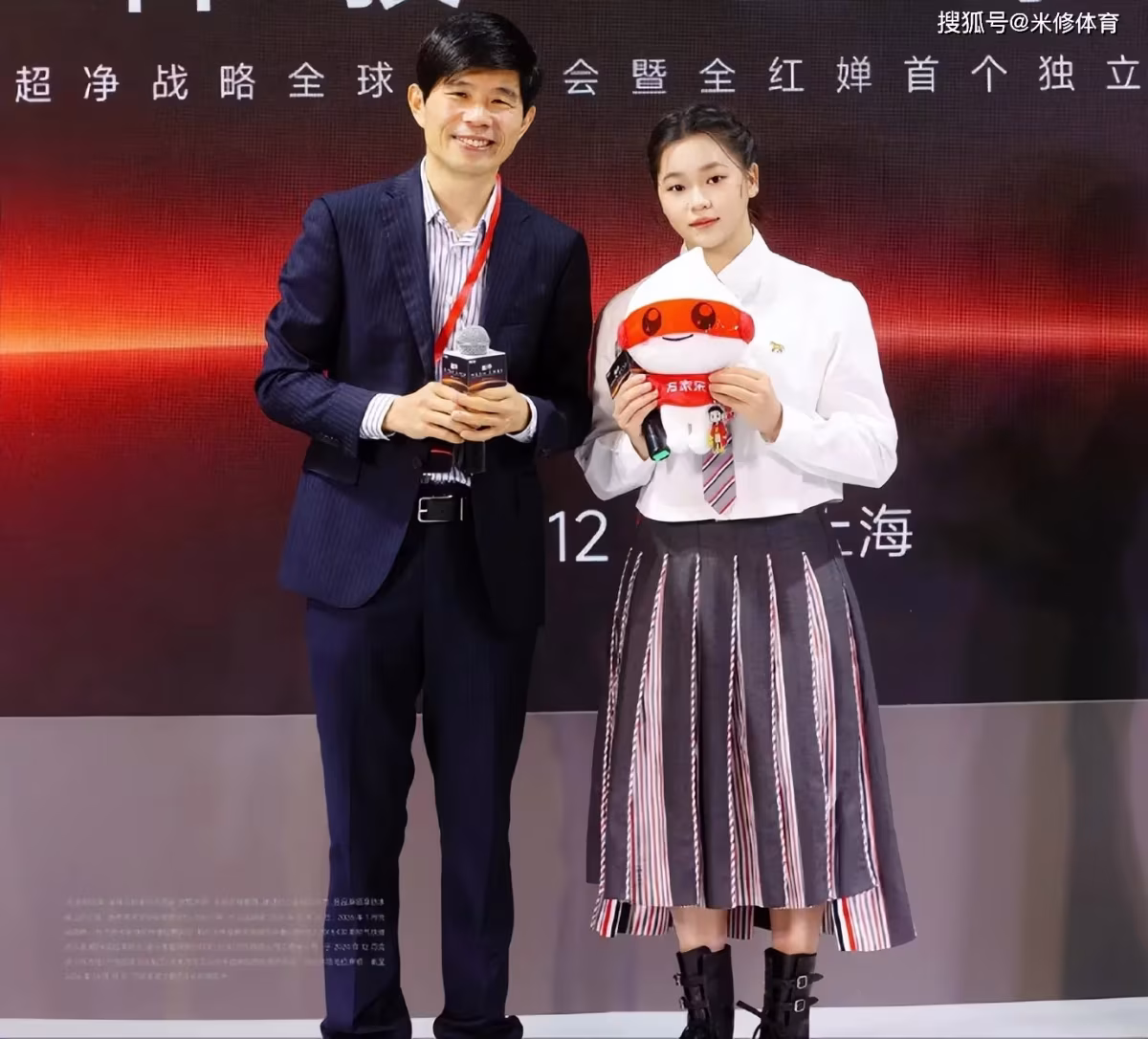 現場,18歲的全紅嬋身穿白襯衫、條紋領帶搭配粉黑豎條紋百褶裙、黑色中筒靴,以清新的「學院風」造型亮相;她的妝容和編髮精緻,展現出反差魅力,讓人感嘆真是「女大十八變」。