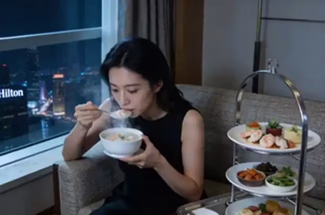 我悠閒地叫了酒店的送餐服務,點了一碗熱氣騰騰的海鮮粥和幾樣精緻的小菜。