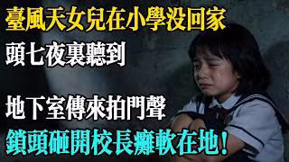 颱風天女兒在國小沒回家,老師堅持人早走了,頭七夜裡警衛聽到地下室傳來拍門聲,鎖頭一砸開校長癱軟