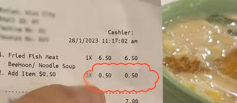 該名女郎Ay Zee於昨天下午3時許,在怡豐城Kopitiam內售賣板面魚湯攤位買了一碗炸魚湯米粉,並添加了淡奶。根據她在臉書上上載的收據顯示,一碗炸魚湯米粉的價格是6元5角,加淡奶後,額外收費5角,共消費7元。