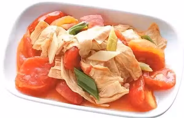 3、熱鍋,倒入2大匙沙拉油燒熱,以中火爆香薑片,放入作法1蕃茄丁拌炒數下,加入作法2豆包片、高湯以及所有調味料拌炒至入味,待湯汁滾沸後加入少許太白粉水拌炒至收汁即可。