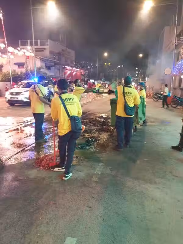 處理清理地面的鞭炮屑外,清潔員工也清理滿地的垃圾。