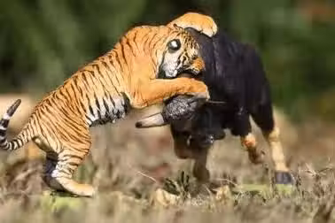 不僅如此,老虎更傾向於發起致命攻擊,它會直接躍到野牛身上,用鋒利的爪子抓住野牛的皮毛,憑藉自身強大的爆發力將野牛放倒,同時用強有力的犬齒咬住野牛的喉嚨,之後會保持鎖喉數分鐘,直至野牛完全致死才鬆開。