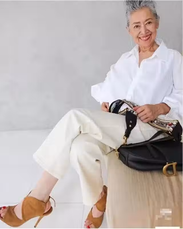 白襯衫搭米色牛仔褲,內藤奶奶的穿搭清爽又溫柔。