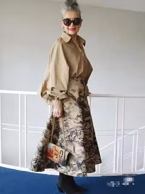 卡其色寬鬆襯衫搭配半身A字印花長裙,內藤奶奶這套穿搭優雅溫柔。