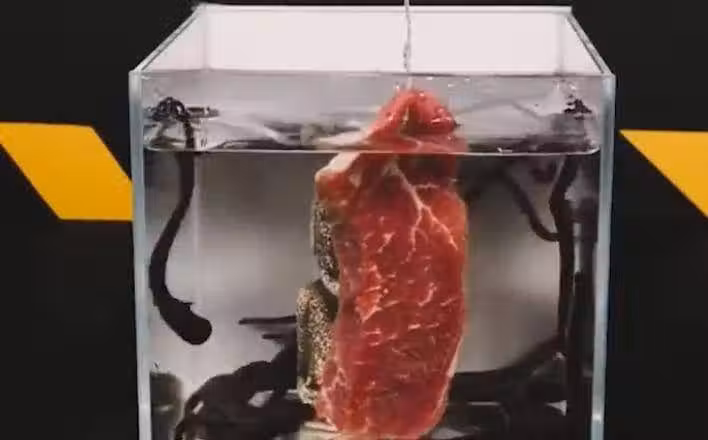 將生牛肉放進了盛滿水質的玻璃缸內,當牛肉剛沉入水底,裡面的水質就變得躁動不安,瞬間蜂擁而至,全部都吸附到了牛肉上,過了十幾分鐘,原本鮮紅的牛肉瞬間變了樣,顏色明顯變淺,看樣子裡面的血液已經被水蛭吸干凈了。