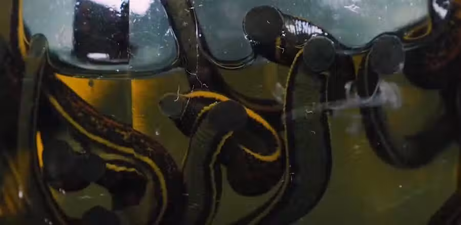 把100條水蛭餓上10天,再丟進一個完整的豬頭,場面一片混亂