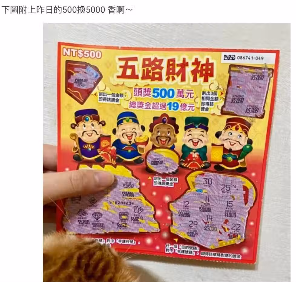 原PO表示,自己買刮刮樂是單純無樂多,以買小金額居多:「比較有印象的就是,100元的中過1000及1200元,500元的中過2500及5000元」還附上自己剛刮500元中了5000的刮刮樂。