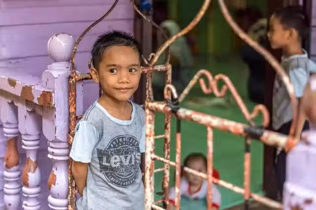 孩童在小巷子裡玩耍,略帶羞澀,目光清澈。