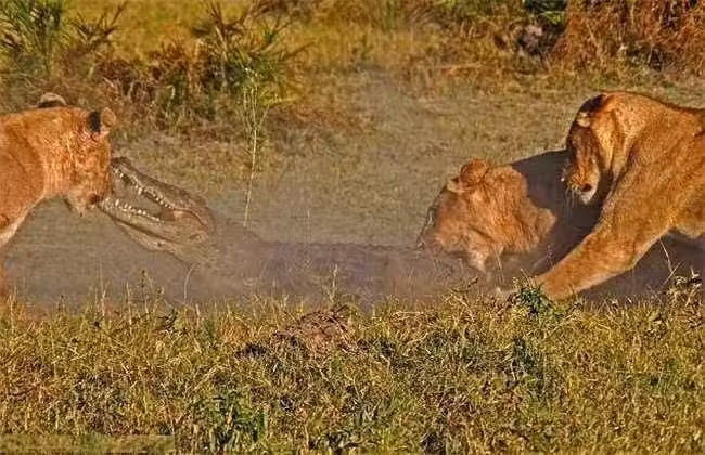 一隻鱷魚想要偷襲幼獅,遭獅群反擊,身體被掀翻成晚餐