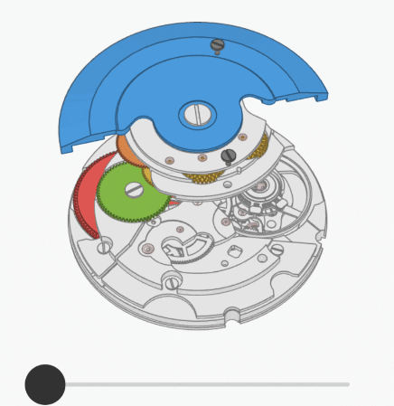 自動陀可以自由旋轉在這裡至關重要。在下面的演示中,您可以看到當手錶在空間中旋轉時,自動陀是怎麼運動的。始終向下的重力——它總是將自動陀向下拉動,使其相對於機芯的其餘部分轉動: