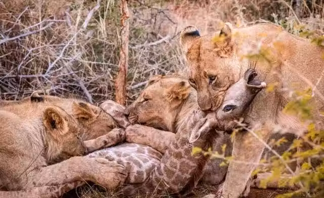 五小隻獅子戲弄長頸鹿寶寶,鹿媽媽親眼目睹卻無能為力,悲痛流淚畫面令人心酸
