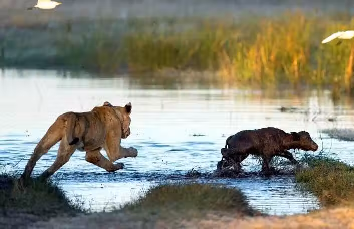 濕地不比草原那般容易實施偷襲,儘管母獅已經足夠小心,但原本毫無防備的小牛還是在最後一刻反應過來,求生本能促使它迅速逃跑。