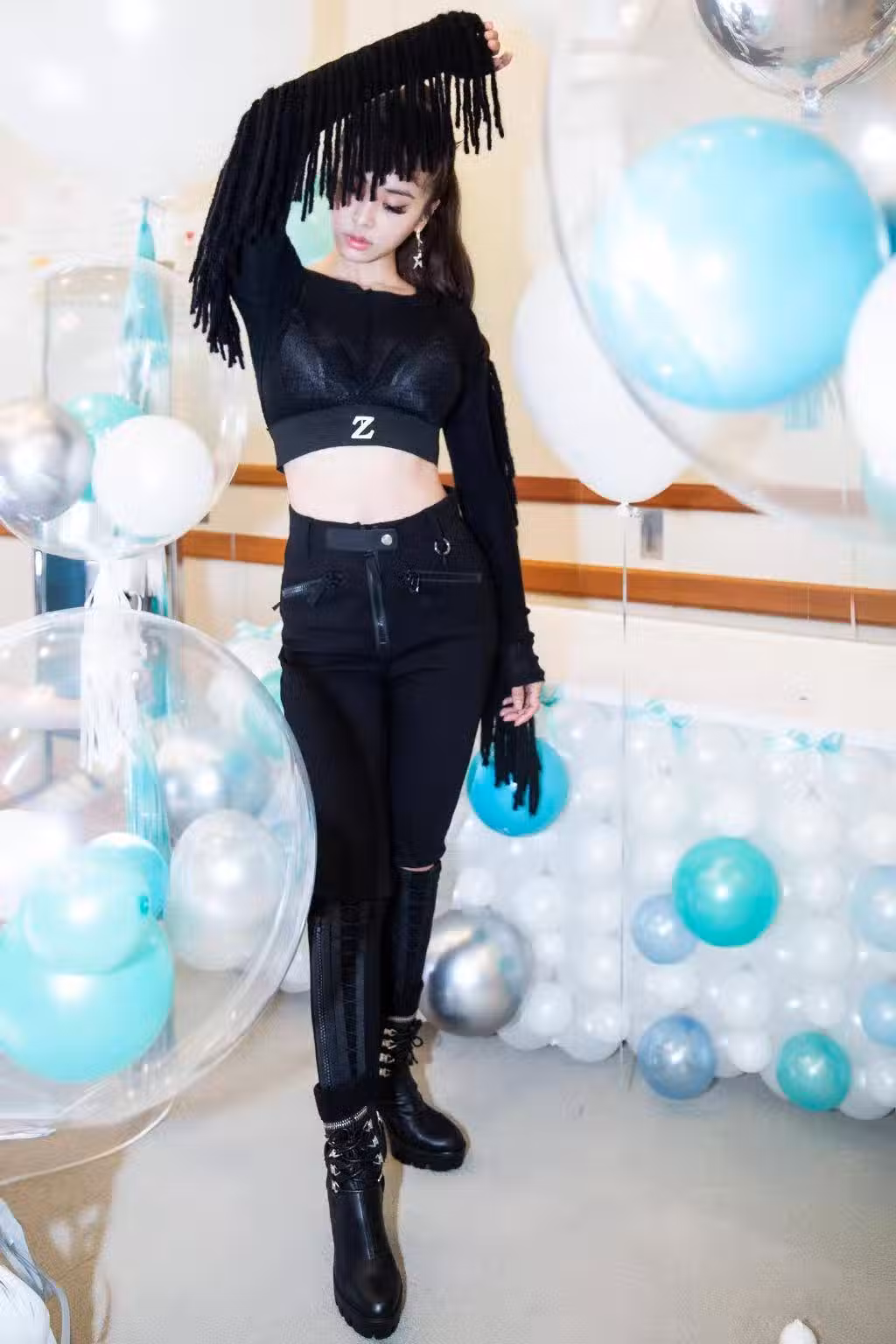 再來看看蔡依林的其它造型。一件黑色流蘇露胃上衣,大方炫腹,下搭緊身牛仔褲。又酷又美,風格獨特難以模仿。她在娛樂圈中的人緣也不錯,和李宇春這樣的歌手也保持了非常好的友誼。
