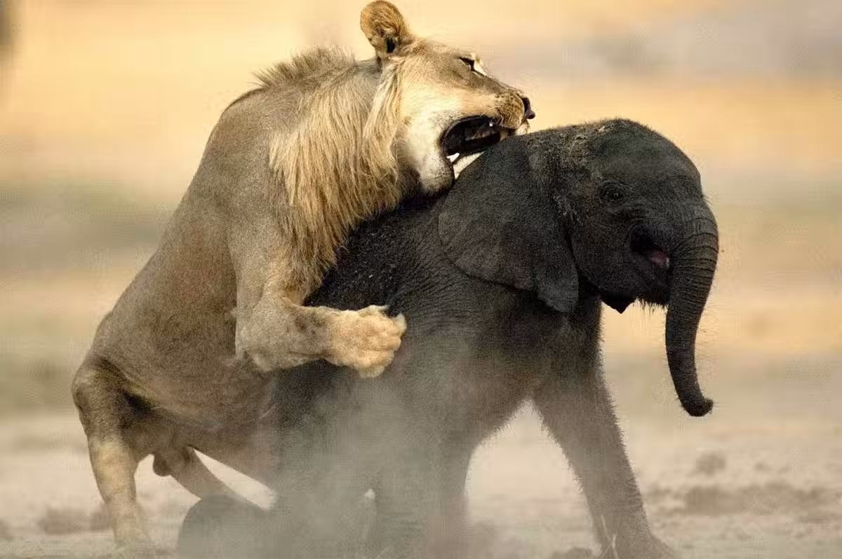 另一次,一個小象群在一個供水點周圍的灌木叢中遭到一群獅子(1隻成年雌獅、2隻3.5歲的雄獅以及1隻3.5歲的雌獅)的襲擊。一隻雌獅跳到一隻落在象群後的5—6歲幼象背上。2隻母象回來保護小象,小象得以逃脫。