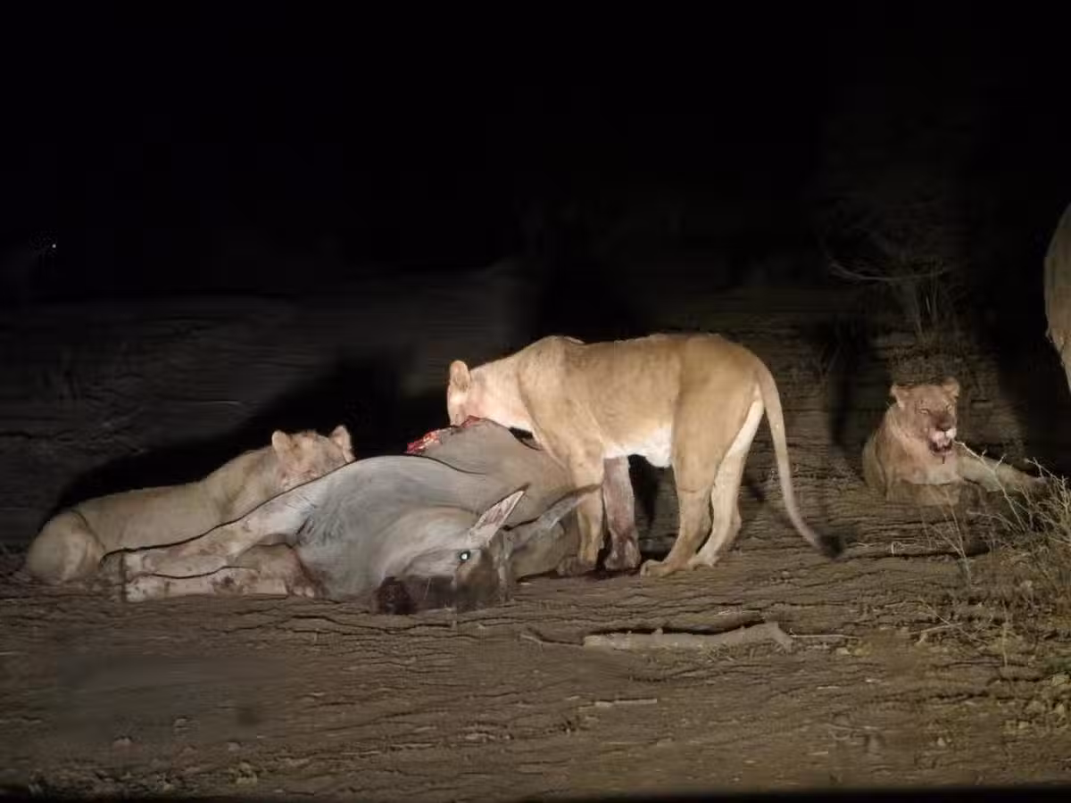 在我們滿以為這是一場雙雄之爭時,現場又出現了另一位不速之客。只見獅子的注意力突然被來自河邊的一道身影所吸引,我們急忙用手電筒朝著該方向照去,是一隻鱷魚!它已離開河中走了50米遠,顯然是想前來分一杯羹。不過,鱷魚出現的突然,但也很快就被踢出局,在它觸及到羚羊前,就被鬣狗趕走了。看來,陸地還是獅子和鬣狗的天下——等等,那是什麼?一隻河馬正直奔現場而來,它徑直沖到羚羊身邊,並迅速開始舔舐羚羊臀部的鮮血。