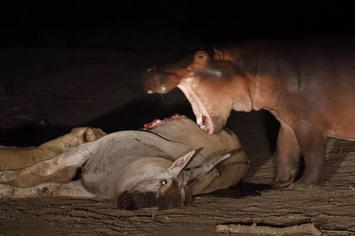 在某個階段,河馬一直嘗試咬下一整塊肉,直到意識到自己的牙齒無法做到才宣告放棄。對於河馬的不請自來,獅子們很不高興,它們試圖將之趕走但是失敗了,其中一隻獅子甚至憤怒到去拍擊河馬的臉部。我們驚愕地觀看了數小時才去睡覺,那天晚上,我們在鬣狗的尖叫聲和偶爾的獅吼聲中緩緩進入夢鄉。