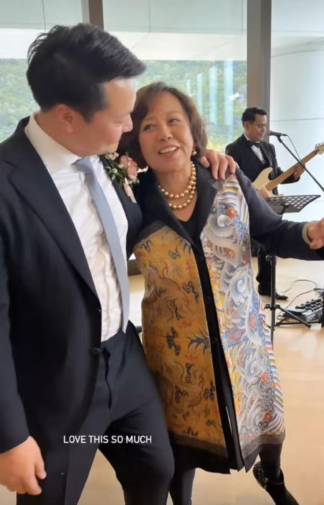 這場婚禮中,最開心的除了郭基浩本人外,她的母親李天穎也顯得極為雀躍。她是在婚禮當天,穿上了一件有龍圖案的大衣,戴上了一條繞頸兩圈的珍珠項鏈,盡顯了貴氣。她是出席這場婚禮的郭家人中最年長的一位,如今也是這一房家中最有威嚴的人物,她挽著兒子出場,盡顯風范,在所有儀式結束後,她還與兒子結伴唱跳,實在好不開心。