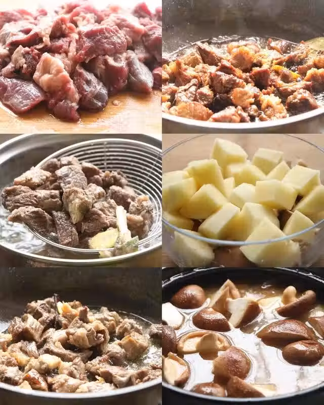 6、土豆去皮後切成小塊,香菇洗凈切成小塊備用;燉至牛肉熟爛,加入土豆和香菇、西紅柿小碎丁、一把粉條,繼續燜煮;西紅柿、粉條忘記拍照了。