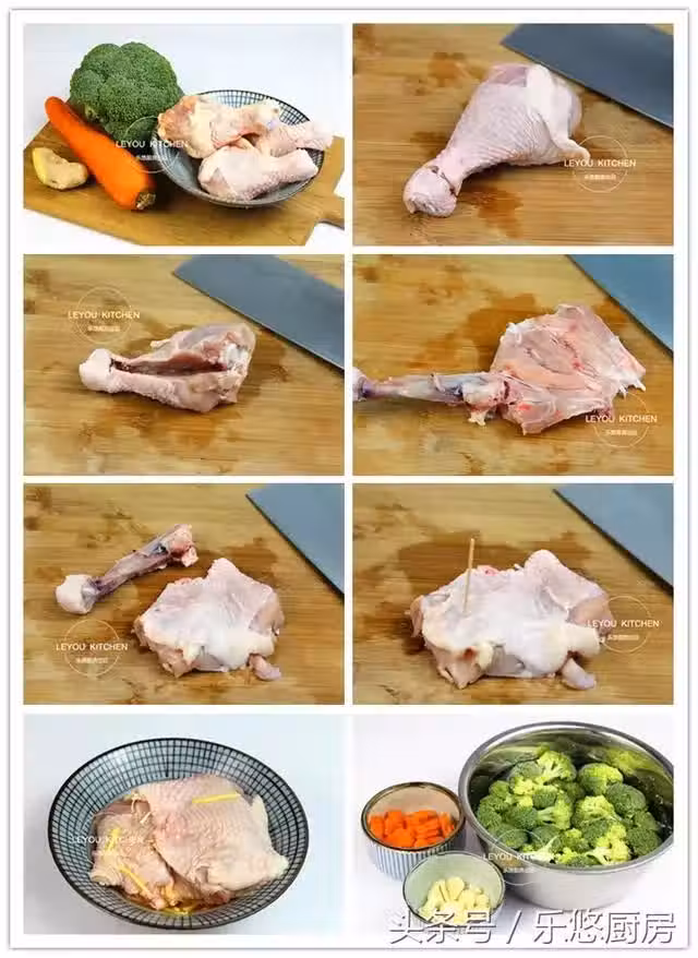第八步:在腌制雞肉的時候,開始處理配菜。把西花蘭掰成小塊、胡蘿蔔切片、蒜切片備用。(西蘭花切好後可以放到淡鹽水浸泡一會兒,這樣口感好也吃得放心。)