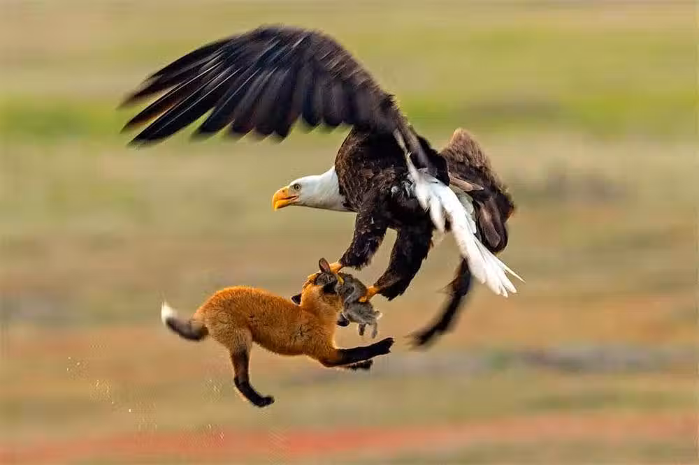 螳螂捕蟬黃雀在後。這個時候飛來了一隻白頭鷹,二話不說,從天上俯衝下來,朝紅狐過來,左爪想要搶奪紅狐嘴裡的野兔。
