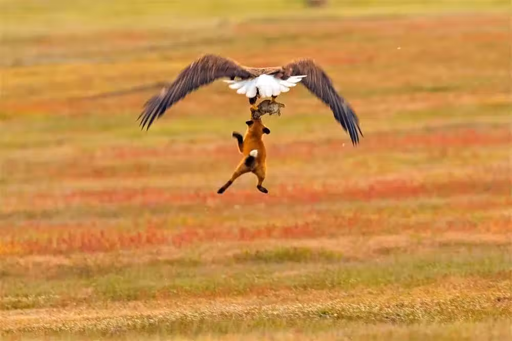 紅狐活捉野兔卻被白頭鷹搶走,不甘心向前竟被帶到空中,記仇紅狐將白頭鷹老巢一窩端!
